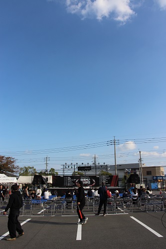 今朝、ステージ前に行きましたら大学祭実行委員会のスタッフたちが円陣を組んで気勢を上げていました。周囲では各模擬店が開店準備を進めています。