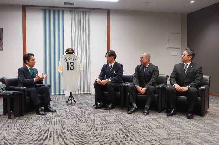 12月16日(火)、今年のプロ野球ドラフト会議で福岡ソフトバンクホークスから2位指名を受け、このたび入団が決まった硬式野球部 稲川竜汰投手が、武内北九州市長を表敬訪問しました。