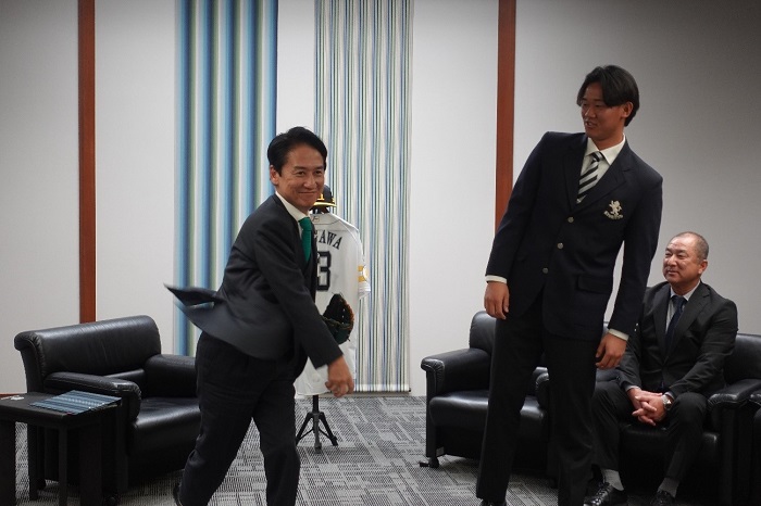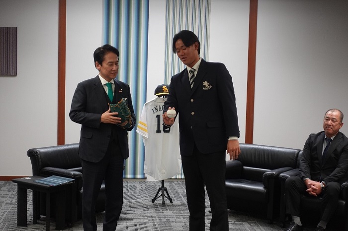 最後に武内市長から、「小さな頃からプロ野球選手を目指し、苦しい練習に耐え、大きなけがを乗り越えて夢の第一歩を掴んだ稲川さんとお会いすることができ、私たちもたいへんうれしく思います。これからは是非、北九州市民の皆さんがわくわくするようなプレーを見せてください。北九州市民球場でプレーする際は、市を挙げて応援したいと思いますので、これからも頑張ってください。」と激励のことばが送られました。