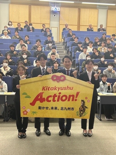 1月7日(水)、本学に北九州市の武内和久市長が来学され、講演会が開催されました。この講演会は、本学の学生に対し、武内市長が描く北九州市の未来像や、そのための取り組み、そして就職先としての北九州市役所の業務等について理解を深めてもらうために開催しました。第一部「北九州市役所内定者トークセッション」、第二部「武内和久 北九州市長講演」の二部構成で、200名近い学生らが参加し、北九州市をリードする武内市長のお話を直接聞くことができる貴重な機会となりました。