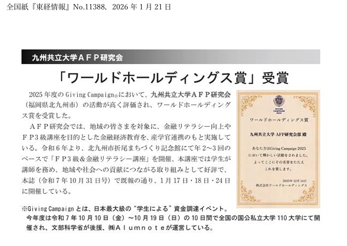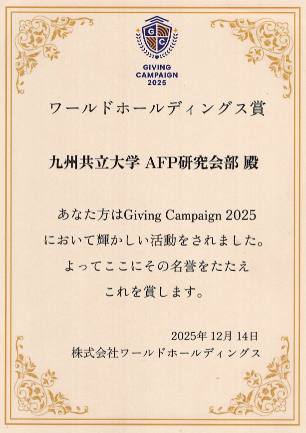 最後に、これまでの活動が、Giving Campaign 2025から「ワールドホールディング賞」を受賞することができました。これもひとえに皆様のご協力の賜物であると感謝の念に耐えません。今後もAFP研究会部員一同、現状に満足することなく、挑戦する気持ちを持ち、このような講座を継続開講しながら産学官連携に基づき、PBL(課題解決型教育)のブラッシュ・アップとその再構築を行います。また、一般市民の方々のニーズに応えるべく、受講者満足度の充実を図れるよう、日々精進し地域・社会貢献に寄与したいと考えています。