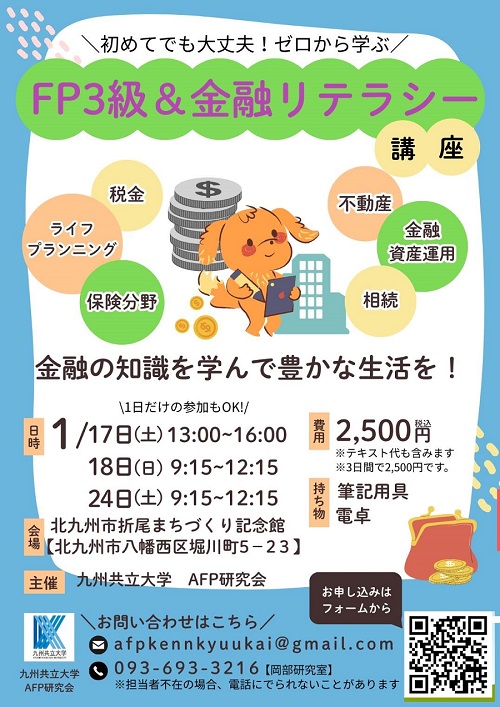 九州共立大学 AFP研究会による一般市民向け「FP3級&金融リテラシー講座」が開催されます。これは学生のサークル「AFP研究会」が主催し、学生たちが講師を務める講座です。