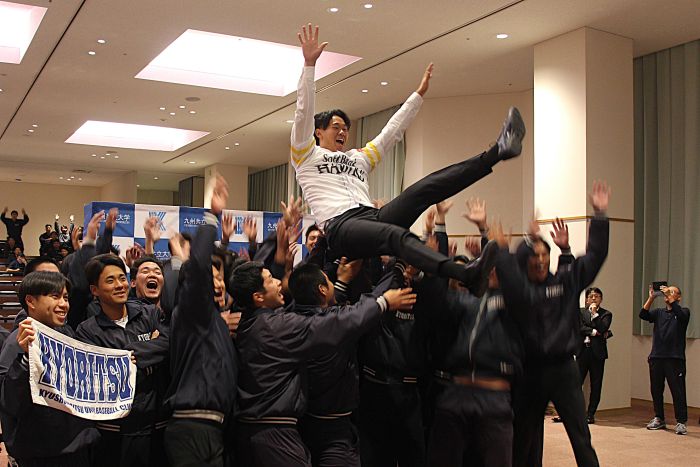 昨日は本学の学生会館・自由ケ丘会館4階多目的ホールに会場が設置され、硬式野球部員はスクリーンに投影される各球団の指名を見守りました。多くの報道陣も集まる中、2巡目で稲川選手が福岡ソフトバンクホークスから指名された瞬間、大きな歓声が起きました。その後、報道陣による稲川選手への質問、そして部員による胴上げが行なわれました。