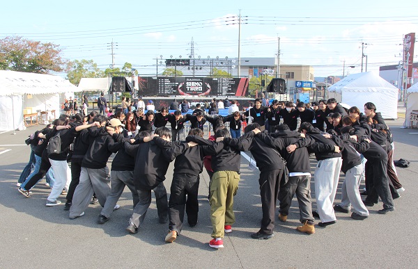 今朝、ステージ前に行きましたら大学祭実行委員会のスタッフたちが円陣を組んで気勢を上げていました。周囲では各模擬店が開店準備を進めています。