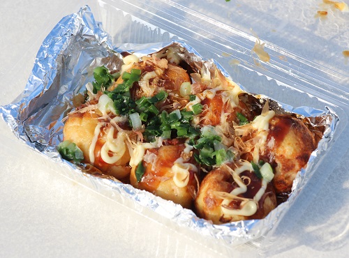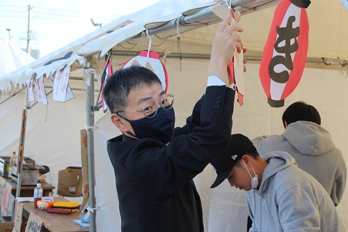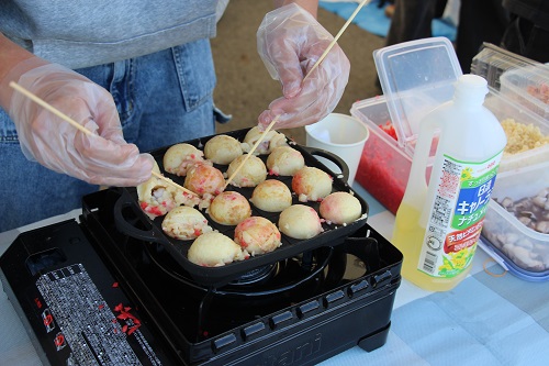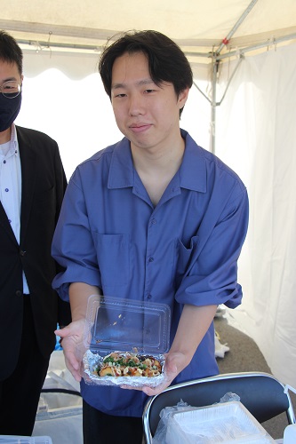 その中でも最初に開店準備が整った「事業創造演習たこ焼き・共立店」でたこ焼きを買いました。美味しいたこ焼きでした。このお店では学生と一緒に堂野崎先生も開店準備を行っていましたよ。
