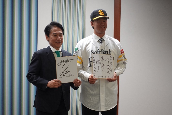 最後に武内市長から、「小さな頃からプロ野球選手を目指し、苦しい練習に耐え、大きなけがを乗り越えて夢の第一歩を掴んだ稲川さんとお会いすることができ、私たちもたいへんうれしく思います。これからは是非、北九州市民の皆さんがわくわくするようなプレーを見せてください。北九州市民球場でプレーする際は、市を挙げて応援したいと思いますので、これからも頑張ってください。」と激励のことばが送られました。