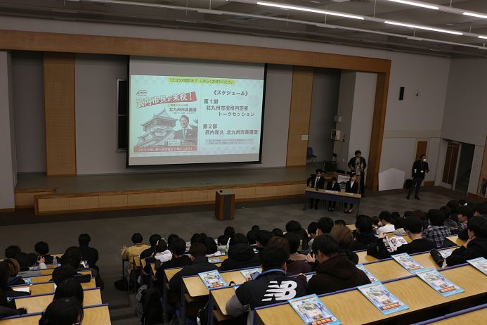 1月7日(水)、本学に北九州市の武内和久市長が来学され、講演会が開催されました。この講演会は、本学の学生に対し、武内市長が描く北九州市の未来像や、そのための取り組み、そして就職先としての北九州市役所の業務等について理解を深めてもらうために開催しました。第一部「北九州市役所内定者トークセッション」、第二部「武内和久 北九州市長講演」の二部構成で、200名近い学生らが参加し、北九州市をリードする武内市長のお話を直接聞くことができる貴重な機会となりました。