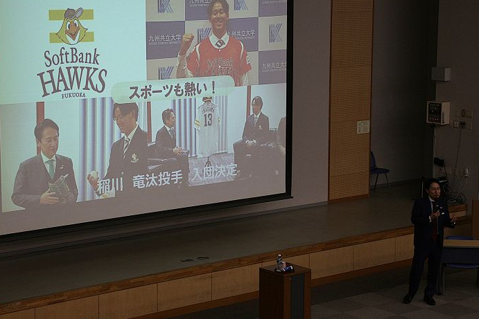 続く第二部では、武内北九州市長が登壇され、北九州市のポテンシャルや魅力を中心に熱く語っていただきました。講演では、本学が所在する折尾地区の再開発について、折尾駅の整備や駅周辺の再開発などのハード面、施設面だけでなく、若者と地域住民の交流など、人を主体とした取り組みに尽力していることについてもお話いただきました。また、北九州市はスポーツも盛んである中、本学がその一端を担っていることに対する感謝のお言葉をいただくとともに、福岡ソフトバンクホークスにドラフト2位指名を受けた本学硬式野球部の稲川竜汰選手が、先月、武内市長を表敬訪問したことについても触れられました。