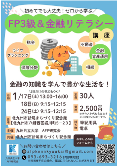九州共立大学学友会のAFP研究会(主将:上田隼士)が主催、北九州市折尾まちづくり記念館との共催で、PBL(課題解決型教育)に基づき産学官連携による一般市民向け国家資格ファイナンシャル・プランニング技能検定(以下、FPという)3級と金融リテラシー検定講座を開講しました。2024年1月の開講以来、同年6月、12月も含め今回で5回目となり、今日に至るまでの参加者から高い評価を得ています。